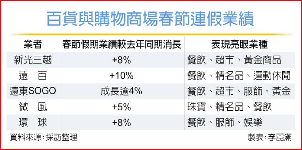 遠東SOGO春節期間各主題餐飲、美食街、超市表現不俗,同時觀察到過年期間犒賞自己經濟發酵,帶動「小確幸型」消費明顯增溫,尤其在男女服飾配件、家庭小家電、寢具床單、文具玩具等都有近3成的成長。此外,金價持續往上,且攻保值與送禮需求的黃金珠寶在春節期間衝出百萬大單。