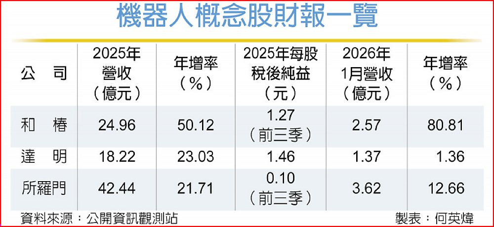機器人概念股達明、和椿及所羅門2025年營運表現亮眼,全年營收皆繳出雙位數年增成績。展望2026年,三家公司不約而同,均將重心放在應用落地與自動化整合商機,隨著全球人形機器人市場快速擴張,成長動能備受關注。