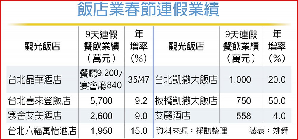 情人節與農曆新年雙節慶助攻,加上餐食升級推升平均客單價,台北晶華、喜來登、寒舍艾美、艾麗、六福萬怡,凱撒飯店等觀光飯店戰勝「出國潮」,春節9天連假餐飲業績開紅盤,成長4%至50%。
