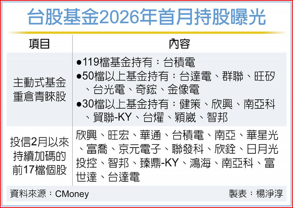 熱騰騰的主動式台股基金今(2026)年1月前十大持股名單重磅出爐,其中,台積電、台達電及群聯等獲得絕大多數台股基金列為核心配置,而若進一步觀察投信2月以來動向,則有包括欣興、旺宏及華通等個股,持續獲得投信在封關前仍加碼、且金馬年開紅盤後仍持續買進,一舉躍升為經理人開年的新「壓寶王牌」清單。