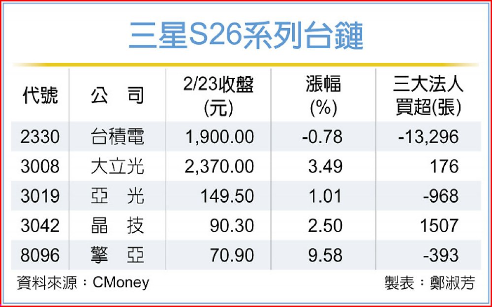趕在新機登場前,相關供應鏈也一一浮出檯面,其中台鏈部分,台積電再度出線,操刀高通晶片代工,晶技則供貨頻率控制元件,光學雙王大立光與亞光則提供S26 Ultra 的高階望遠與自拍鏡頭等關鍵鏡頭零組件,另三星感光元件與記憶體在台主要代理商擎亞也可望雨露均霑。