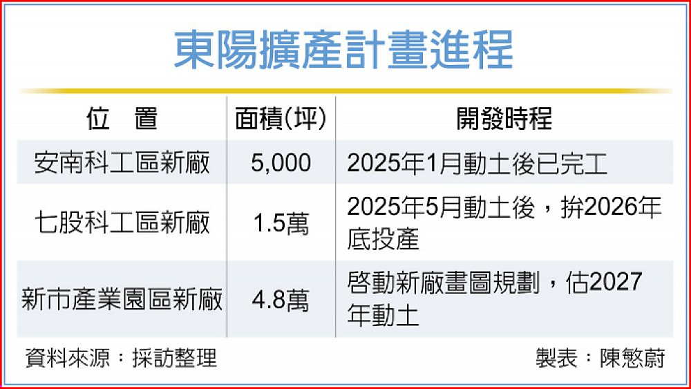 東陽樂觀未來3~5年市場需求成長動能,除持續強化產能供應,繼1.5萬坪七股科工區新廠於去年5月動土興建後,23日宣布啟動台南新市產業園區的建廠規劃。東陽表示,占地約4.8萬坪的新市園區,目前也進入廠區設計畫圖階段,預計最慢明年動土興建。