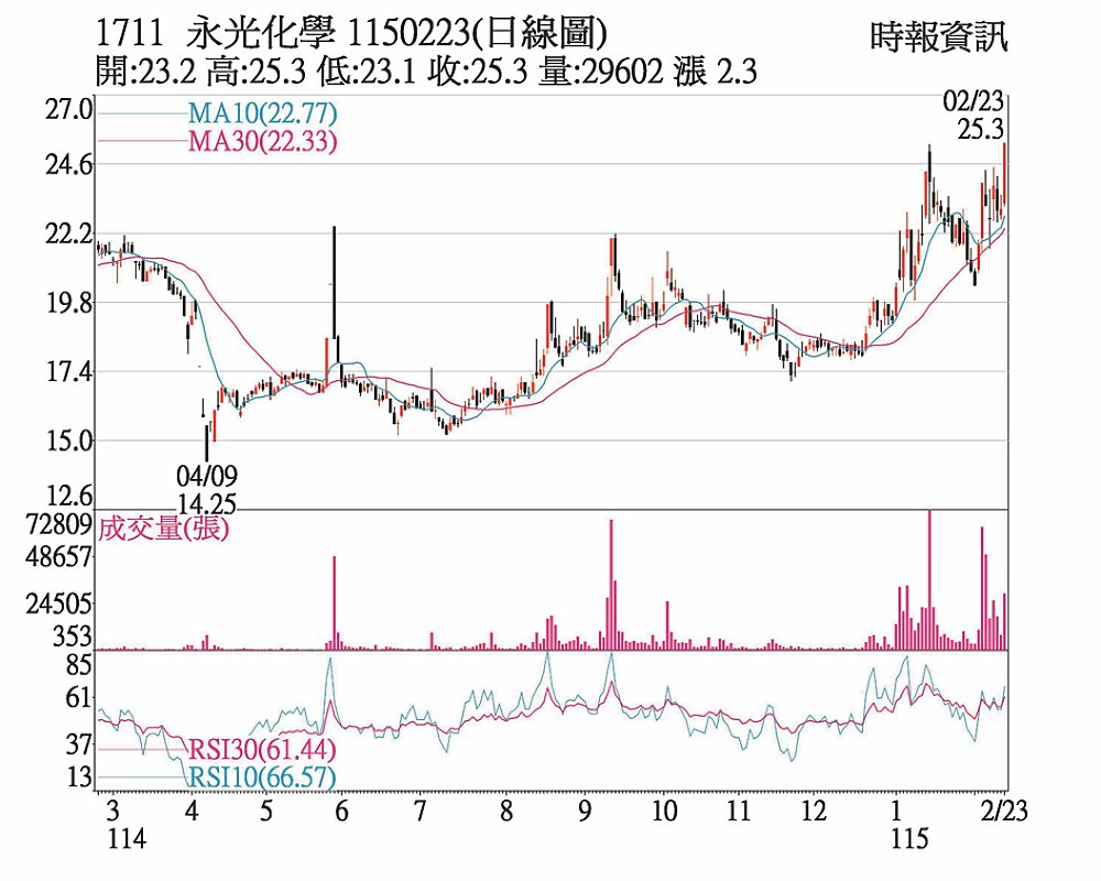 永光(1711)因電子化學品業績持續看增,PSPI(感光型聚醯亞胺)今年驗證、量產進度受矚目,23日股價由特定買盤進拉抬,帶量強勢漲停,終場收25.3元,成交爆量2.95萬張,其中外資、自營商分別買超6,040、550張。短線多空量能由弱轉強,KD值也強勢攀揚向上。