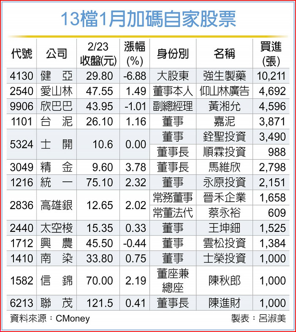 另也不乏多家董總或經營高層自掏腰包加碼護盤,如欣巴巴副總黃湘允加碼4,596張、精金董事長馬維欣繼去年12月大買2,100張後,今年1月再擴大加碼,大敲2,798張、高雄銀常董法代蔡永裕、太空梭董事王坤鈿、信錦董座陳秋郎及聯茂董座陳進財都各加碼千張。