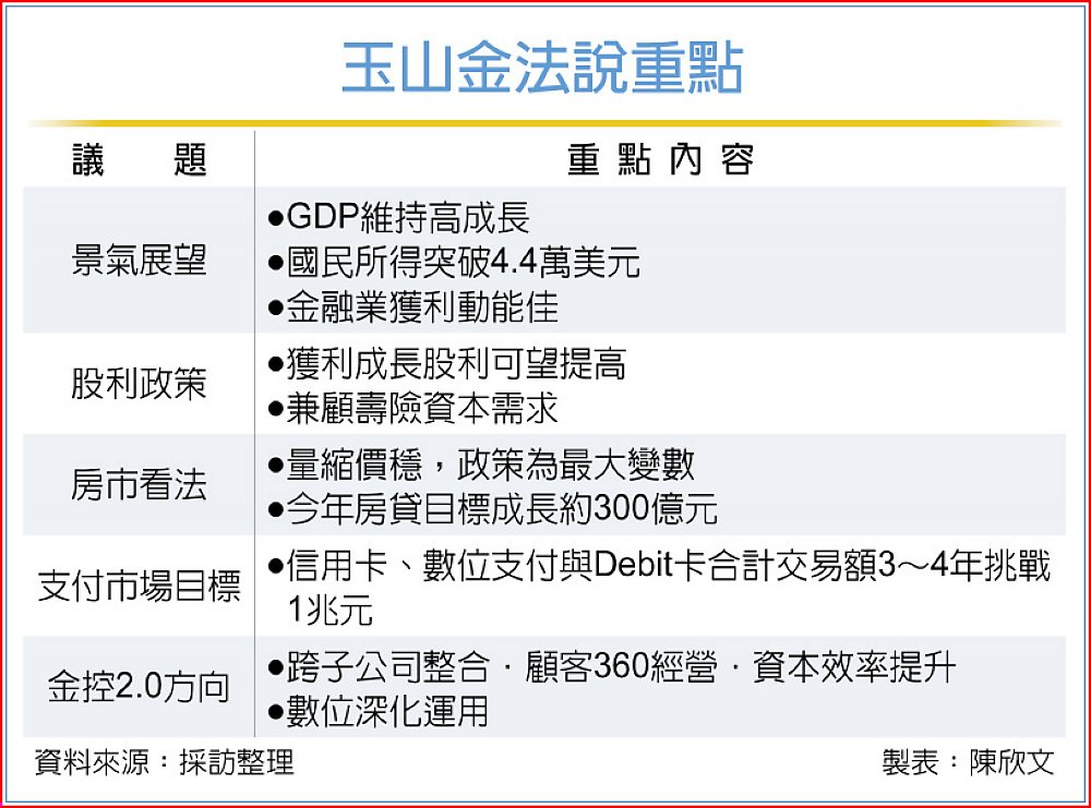 玉山金控去年稅後純益成長31.2%達342.9億元,每股盈餘2.12元,創下歷史新高紀錄,面對市場高度關注的股利政策,董事長黃男州表示,「股利應該要隨著獲利成長」,從目前資本結構與盈餘水準來看,具備兼顧現金股利與壽險資本需求的空間。此談話意味今年股利應高於去年的每股1.3元,並同時正式啟動「金控2.0」。