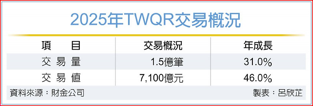 據財金公司統計,2025年電子支付跨機構平台「TWQR」交易量約1.5億筆、交易值約7,100億元,分別較2024年大幅成長31%、46%,交易量值均持續增加,成長力道明顯攀升。