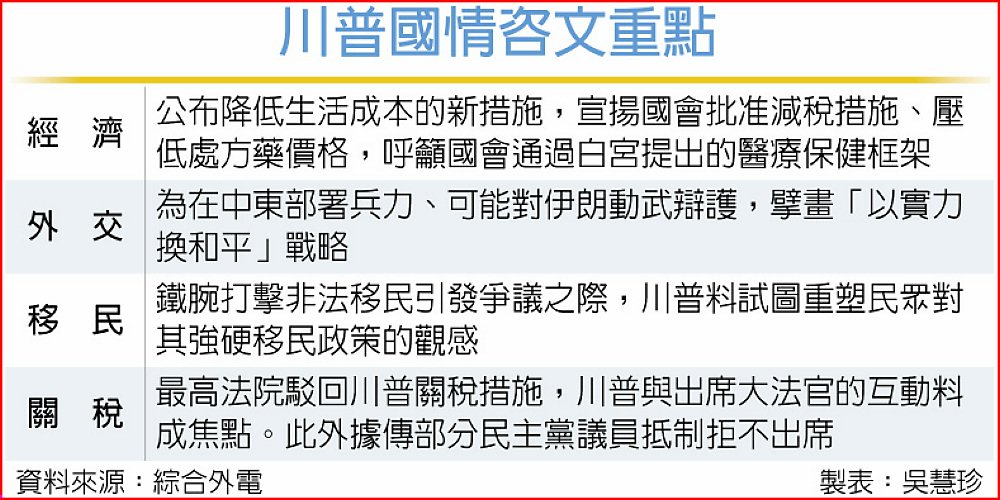 美國總統川普美東時間24日晚間9時(台灣時間25日上午10時)發表國情咨文演說,在民調低迷及今年期中選舉的壓力下,川普料強打經濟牌,發表降低生活成本的新措施來化解民怨。此外他也將著墨外交政策,主打實力換取和平的戰略。