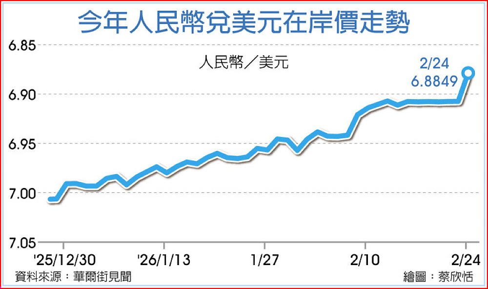 大陸股市在馬年首個交易日開紅盤,上證指數24日成功收復4,100點大關,帶動市場情緒顯著升溫。與此同時,匯市表現同樣強勁,人民幣兌美元在岸價24日升值265個基本點,收在6.8849元,創下近34個月以來新高。