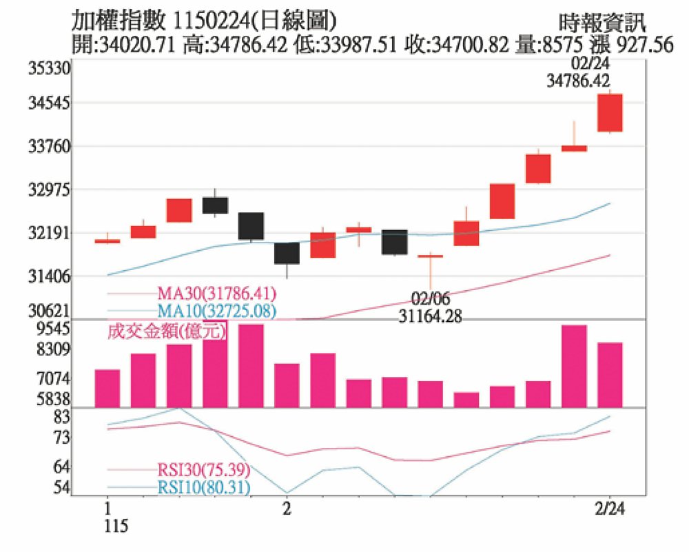 從技術面觀察,台股站上34,000點,均線維持多頭排列,搭配KD、MACD等指標同步走強,有利維持中多格局。籌碼面上,2月來外資與投信同步站在買方,法人操作偏正向。