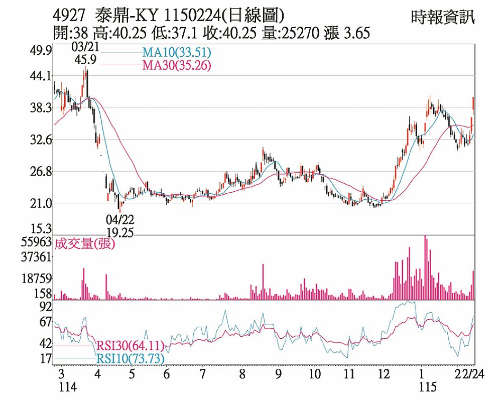 泰鼎-KY(4927)近期股價整理後反攻,24日以38元開出,不到一小時便再度強攻漲停,一路鎖在漲停價40.25元作收,上漲3.65元,站穩所有均線之上,成交量2.51萬張,為1月12日以來大量。PCB族群近期受資金青睞,三大法人已連3個交易日買超泰鼎,其中,外資大舉回補逾1.18萬張。