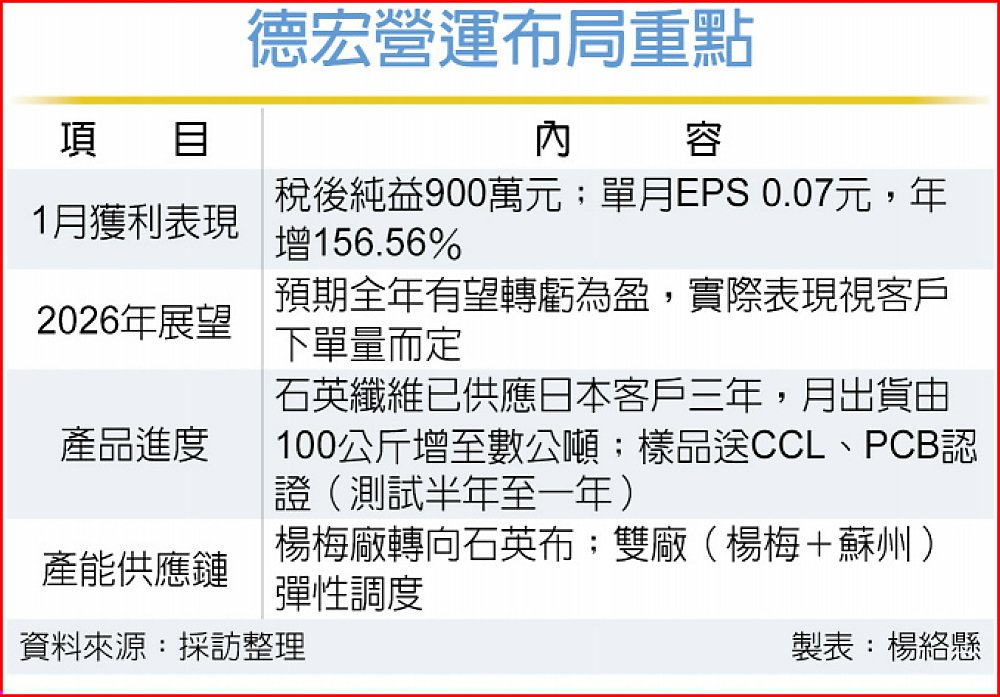 德宏(5475)因股價波動達公布注意交易資訊標準,24日公布1月營收1億元,年增101.73%;單月稅後純益900萬元,每股稅後純益(EPS)0.07元,年增156.56%。受惠中國大陸推動「反內捲」措施,帶動傳統玻纖布報價與銷量同步回升,市場預期該公司2026年有望實現全年轉虧為盈。