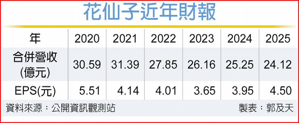 花仙子(1730)近年結束鍋具代理,且台灣市場減少促銷,有效提振毛利,加上東南亞市場,如菲律賓等業績大幅成長帶動下,去年營收24.12億元,雖年減4.49%,但每股稅後純益(EPS)4.5元,比2024年的3.95元提升,創近五年新高。花仙子指出,台灣市場追求穩定及毛利率提升,加大投資東南亞市場,打造第二成長曲線。