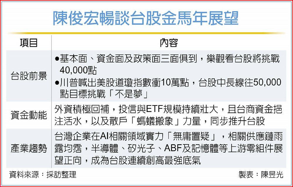 隨著台股新春以來連續上漲創高,市場喊出加權指數有望衝上40,000點,陳俊宏指出,在基本面支撐下,對此位置抱持樂觀以對看法,尤其川普喊出道瓊指數將衝10萬點,台股與美股高度連動,中長線往5萬點邁進也並非不可能。