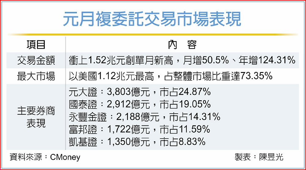 觀察1月複委託主要券商表現,元大證因新增外資機構法人海外債券交易客戶,推升交易金額暴衝至3.803.11億元,據券商公會資料顯示,專業機構投資人交易金額達2,747.34億元,也拉抬單月市占率跳高至24.87%,比去年同期增加12.68個百分點,登上單月複委託交易券商榜首。