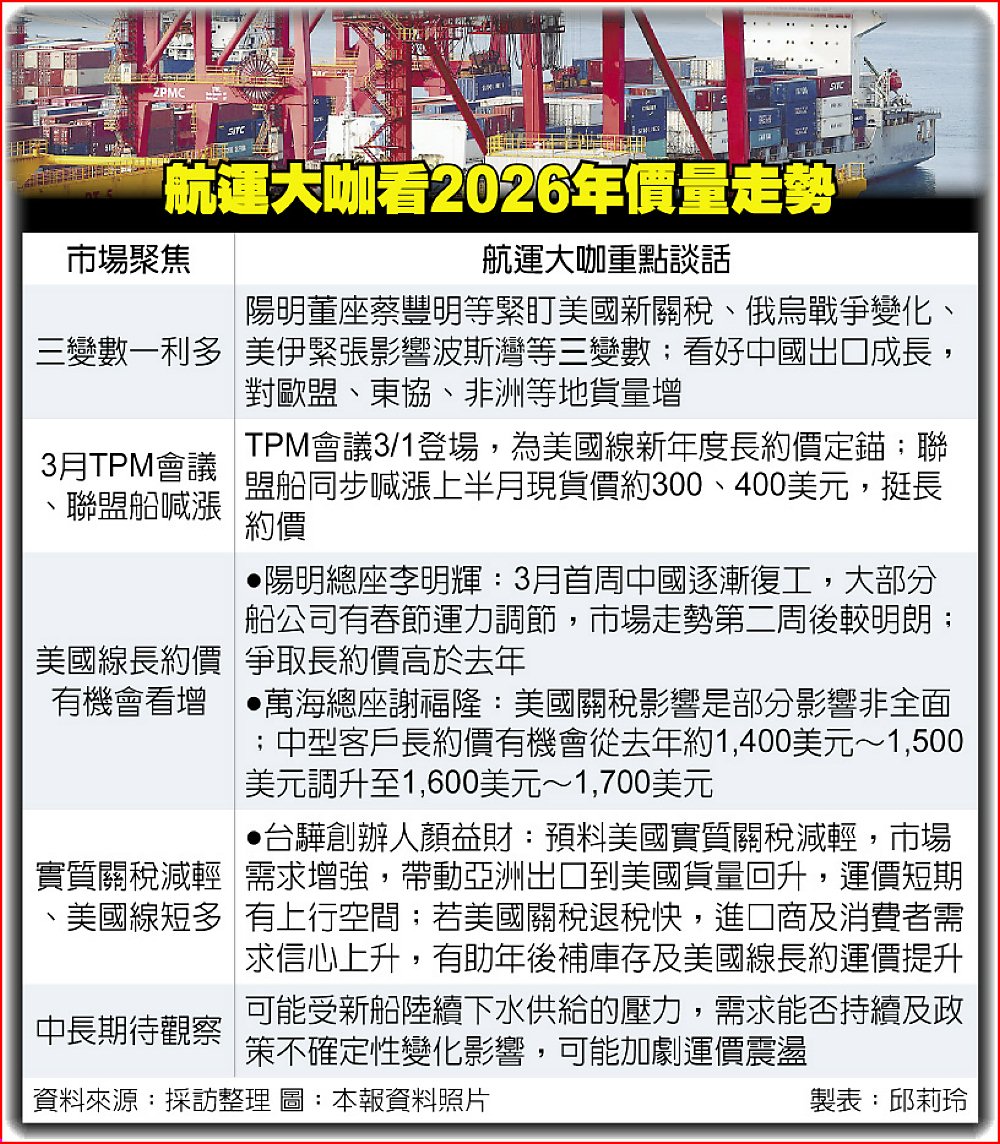 航運界25日舉辦春節團拜,航運業在連續六年獲利之後,無不希望馬年繼續奔跑賺大錢。陽明、萬海認為,今年市場不確定性仍高,需緊盯美國新關稅、俄烏戰爭變化、美伊緊張影響波斯灣等三大變數發展,但美國關稅主要影響中美貿易,去年中國輸美雖衰退,但整體出口成長,對歐盟、東協、非洲等國家貨量明顯增加,預料這個趨勢持續,海運業是看全球市場,對今年市況樂觀。