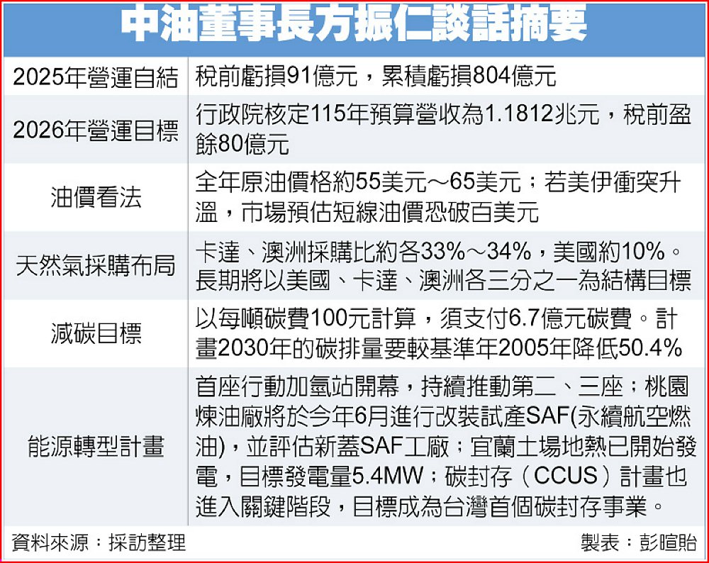 中油25日舉行新春記者會,董事長方振仁表示,受到原油價格從年初高檔逐步往下走,營運壓力較大,加上依相關規定評價減損油氣權益125億元影響,中油去年稅前虧損91億元,累積虧損804億元,若扣除礦區認列因素,去年本業營運實屬獲利狀態。