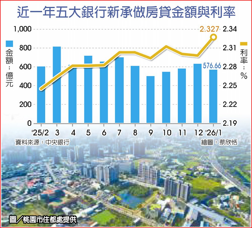 開年以的房市降溫走勢延續,元月六都建物買賣移轉棟數月減8.3%。此一現象,同步反映在中央銀行公布的五大銀行新承做房貸金額及利率上,元月新增房貸月減67.74億元至567.66億元,利率較低的新青安貸款及築巢優利貸,比重同步下滑,致新增房貸利率上揚至2.327%,創2009年1月以來、逾17年新高。