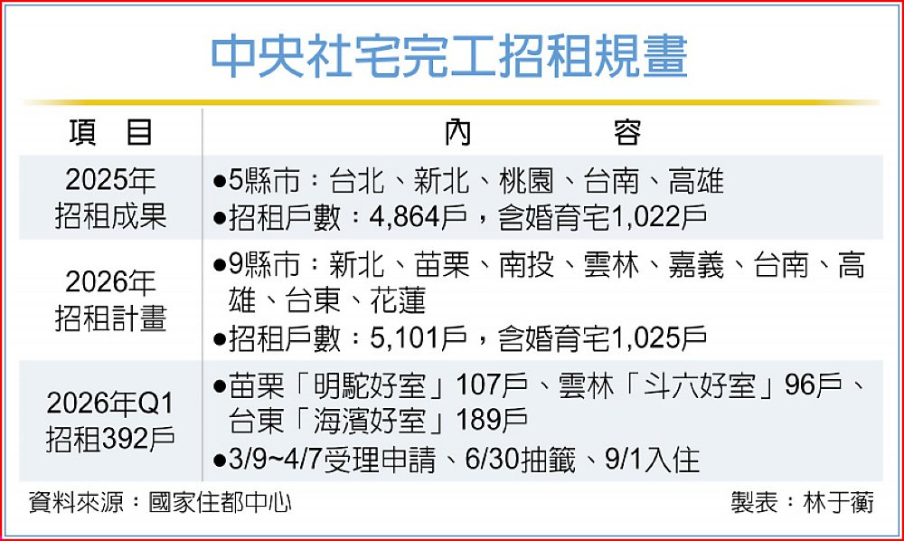 國家住都中心2025年共招租了4,864戶社宅,其中有1,022戶是婚育宅,整體申請的件數達到22,704戶;今年則預計在9個縣市、提供5,101戶社宅招租,其中有1,025戶為婚育宅,預期未來兩年完工的社宅數量將會越來越多。