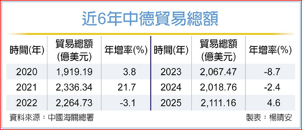 中國海關總署統計,2025年中德貿易總額年增4.6%至2,111.16億美元,中國是德國最大貿易夥伴。