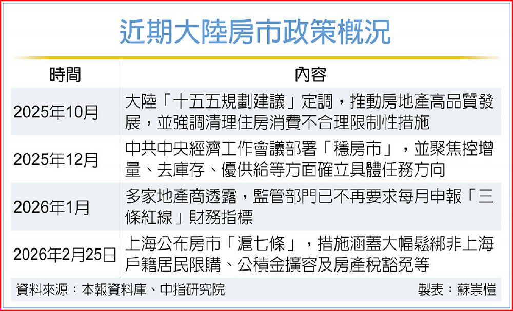 回顧2025年,大陸房市整體處於量縮價跌的調整期,官方為了穩住市場,從2025年底便開始定調穩定房地產、去化庫存。到2026年初,實施多年的「三條紅線」建商財務指標傳出已不再要求每月申報,顯示官方嚴格的監管措施正逐步退場。