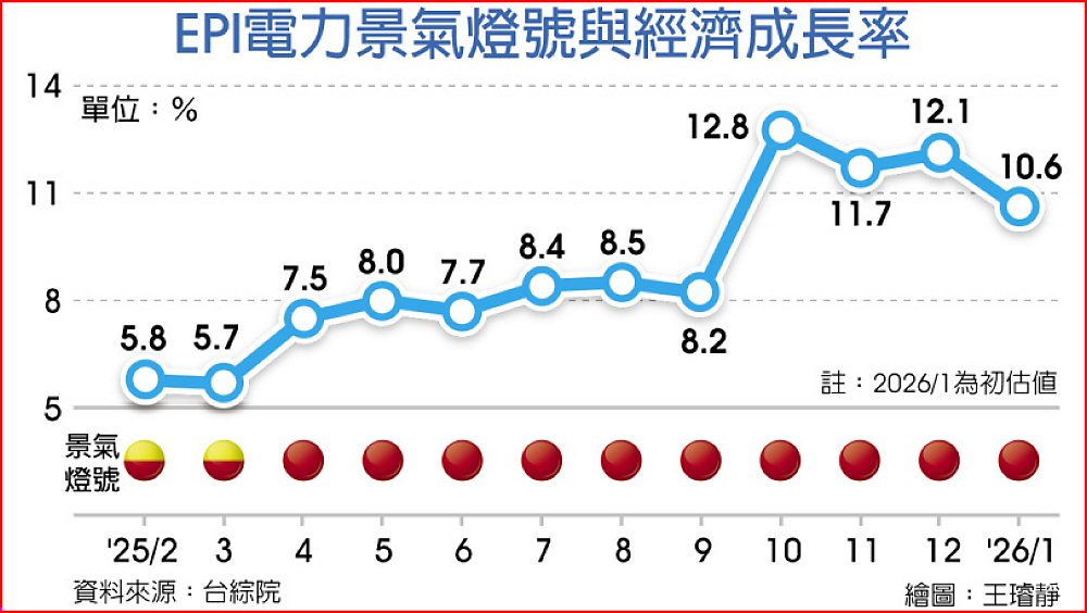 基於AI科技產業熱度延續、半導體產業動能強勁,相關供應鏈用電需求穩健成長,推升全國產業高壓以上用電量,較去年同期成長4.65%,整體產業電力景氣燈號續呈熱絡的紅燈,且是自去年4月至今連紅10個月。因全球AI熱潮延續與低基期因素交互作用,國內經濟維持高成長動能,台綜院預測2026年1月經濟成長率為10.6%。