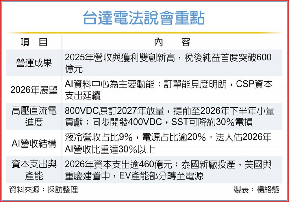除800VDC外,台達電亦同步開發400VDC系統並與客戶合作測試中。公司評估,高壓直流電產品主要動能仍落在2027年,目前屬於前期導入階段,實際放量時程將依客戶系統設計與驗證進度而定。
