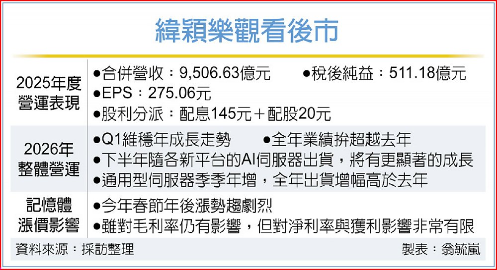 緯穎2025年每股稅後純益(EPS)275.06元,有望奪下台股每股獲利王寶座。董事長暨策略長洪麗寗與總經理林威遠26日於法說會中齊聲看好2026全年業績「超越去年」,除AI伺服器在下半年將有ASIC新專案與AI GPU新平台加入、帶來更明顯增長動能,通用型伺服器更是看到季季成長並優於去年的強勁需求。