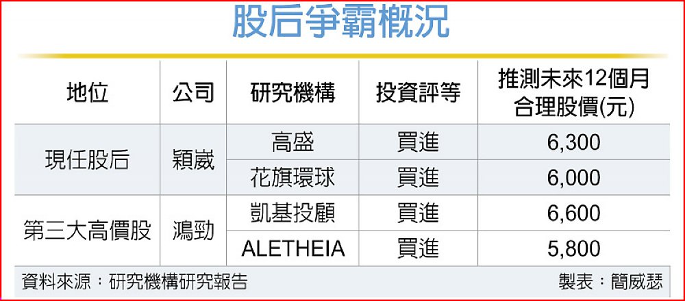 股后寶座二大強力競爭者各有研究機構擁護,高盛證券最新將穎崴推測合理股價由4,500元升至6,300元,花旗環球證券給出6,000元股價預期;至於凱基投顧、ALETHEIA則分別賦予鴻勁6,600元與5,800元股價預期。就此看來,儘管內外資研究機構對二大高價股的評價期望略有差異,得出的目標價卻在伯仲之間,短期內誰能真正把股后寶座收入囊中,還是未定數。
