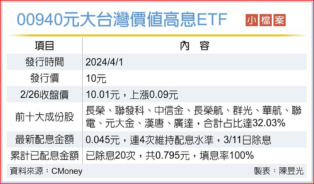 進一步統計,00940發行以來已配息過20次,累計配息金額達0.795元,且填息率達100%,最新一次除息訂今年3月11日,配發0.045元,連四月維持相同配息水準。