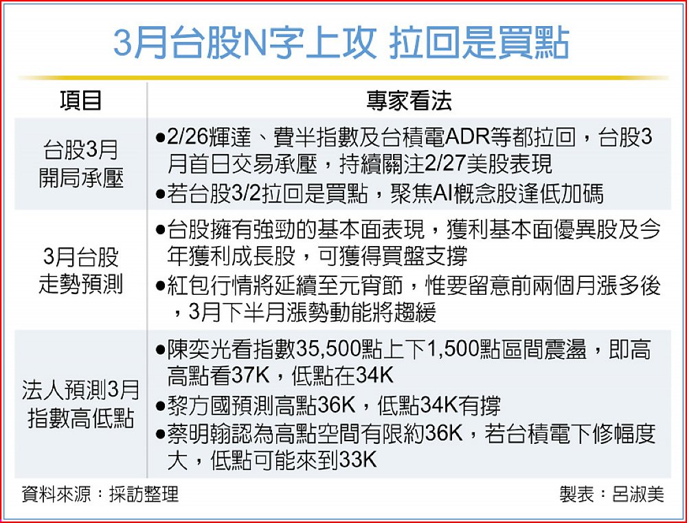 台指期26日夜盤跌525點收在35,086點,高低震盪近千點,從上看36K到守35K。展望3月台股後市,陳奕光認為3月將呈現N字型先攻再拉回,預期指數高點有機會上看37K,下半月可能回測34K,黎方國則看高點36K、低點34K,蔡明翰則略顯保守,高點看36K,而低點看33K是因台積若漲多拉回
