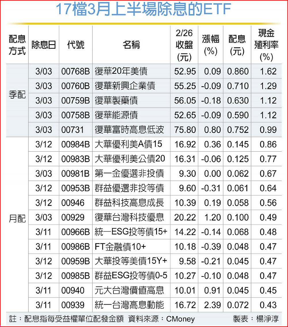 本波除息包括12檔債券型ETF與5檔台股高股息ETF,3月3日除息、3月2日為最後買進日的有月配息的復華台灣科技優息、第一金優選非投債,以及季配息的復華20年美債、復華富時高息低波等。