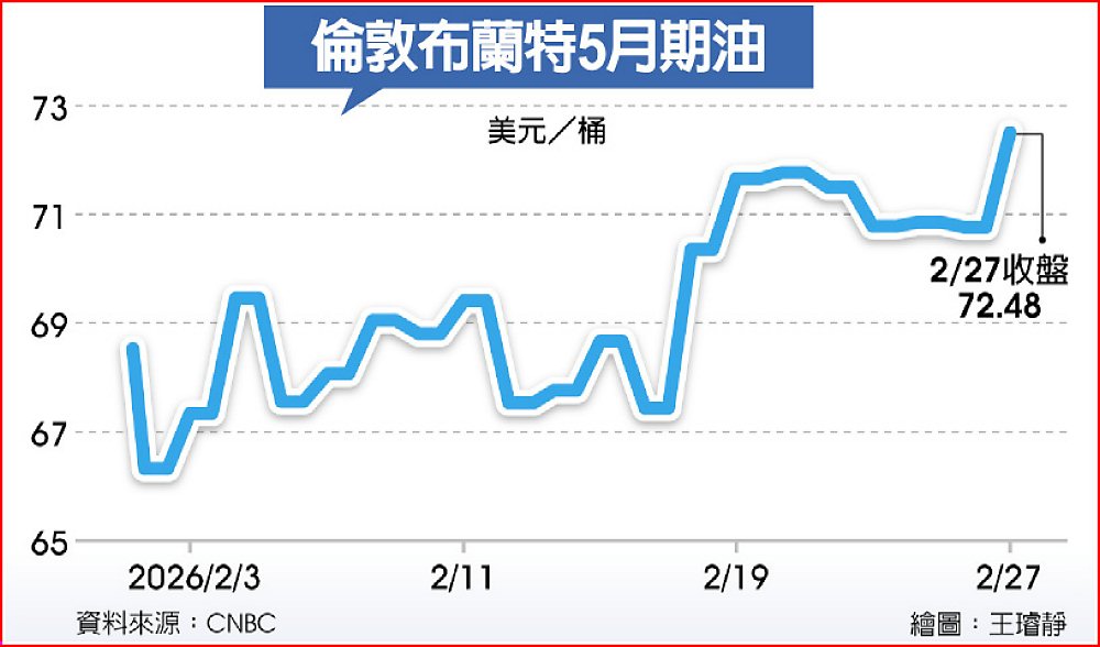 國際報價基準的倫敦布蘭特油價,其5月期貨在2月27日每桶上漲2.4%收72.48美元,主要是美伊兩國未能在核計畫上達成協議。在伊朗遭攻擊後,加上中東局勢動盪更不明朗之下,外界認為油價短期內將繼續走高。