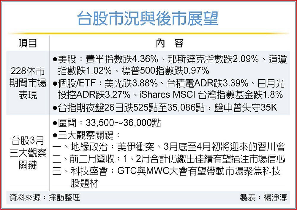 台股期現貨市場因228連假,2月27日休市一日,台指期夜盤26日終場下跌525點至35,086點,盤中一度跌破35K整數關卡,美股四大指數在台股休市期間跌0.97%~4.36%,台積電ADR也下跌3.39%,預估將壓抑台股3月開局表現。