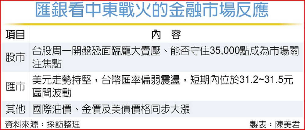 中東戰火衝擊全球金融市場,國銀資深匯銀主管分析,地緣政治「黑天鵝」令市場避險情緒急速升溫,台股2日開盤面臨賣壓、能否守住35,000點成為市場關注焦點;匯市方面,美元因具有避險功能,短期內估走勢持堅,新台幣匯率預料與台股亦步亦趨,維持偏弱震盪走勢,估計短期內位於31.2元~31.5元區間波動。