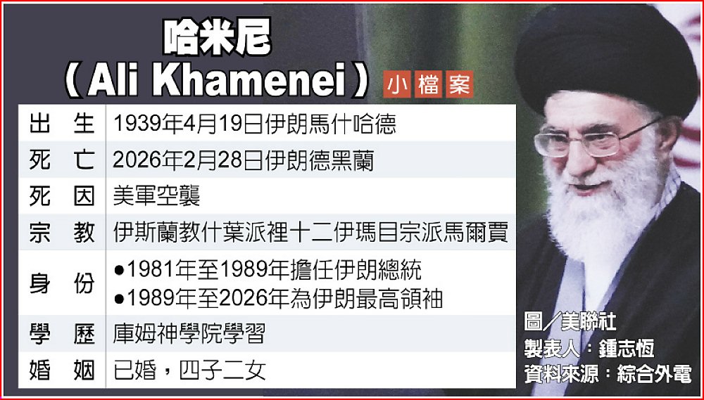 伊朗86歲最高領袖哈米尼被證實,在美國和以色列襲擊中喪生,伊朗政府宣布全國哀悼40天。目前外界無從得知誰將接替其最高領袖地位。美國中情局估計,將由伊斯蘭革命衛隊裡強硬派人物繼承。若真如此,戰火可能在中東擴大。