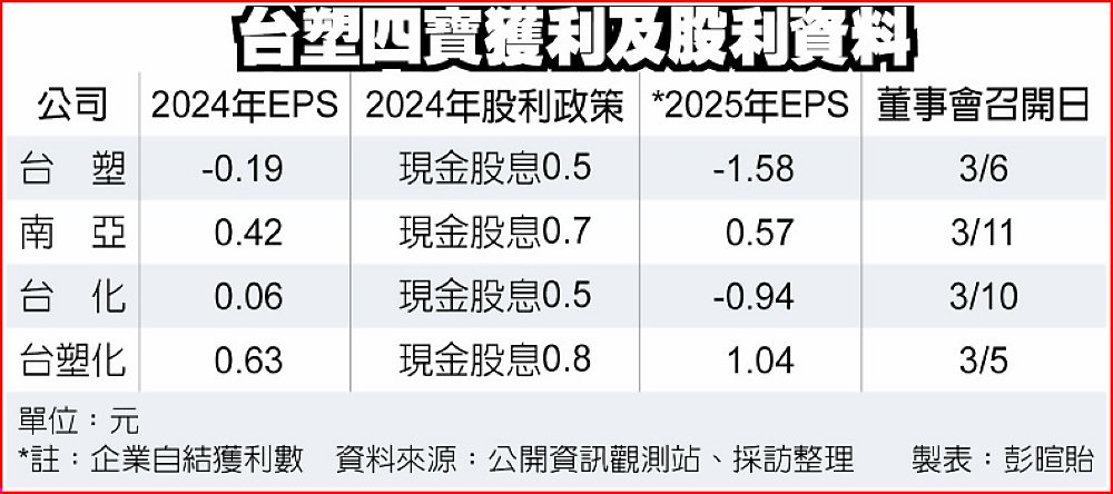 台塑四寶獲利及股利資料將在3月上旬陸續召開董事會,通過去年財報及股利政策。台塑化、南亞去年獲利聯袂逆勢成長,惟石化行情仍處低檔,台化、台塑虧損放大,重挫四寶去年營運合計虧損10.93億元,股利政策規劃引發關注。