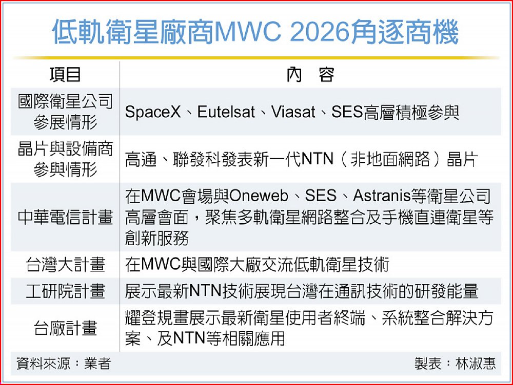 MWC 2026將於3月2日登場,預計吸引超過10萬人參觀、來自全球219個國家及地區逾2,900家廠商參展,除了Verizon、Vodafone、高通、聯發科、華為、愛立信、諾基亞等全球電信商、晶片、設備商齊聚一堂,SpaceX總裁暨營運長Gwynne Shotwell、Eutelsat歐洲通信衛星集團執行長Jean-Francois Fallacher,及Oneweb、SES、Astranis等衛星公司高層都將親自出席這場盛會。