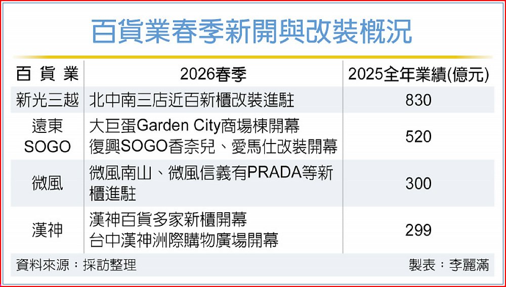 百貨業開年改裝迎春,今年春天受矚目除了SOGO大巨蛋B棟商場、台中漢神洲際購物廣場陸續在3月底、4月上旬開幕,新光三越亦在全台北中南發動近百櫃位改裝,其中台北信義新天地更有全台首發,東南亞第一家餐飲獨角獸Kenangan Coffee進駐A11,微風廣場年前即在信義區開出PRADA等新櫃,遠東SOGO復興店則預計3月、5月迎來香奈兒、愛馬仕改裝開幕。