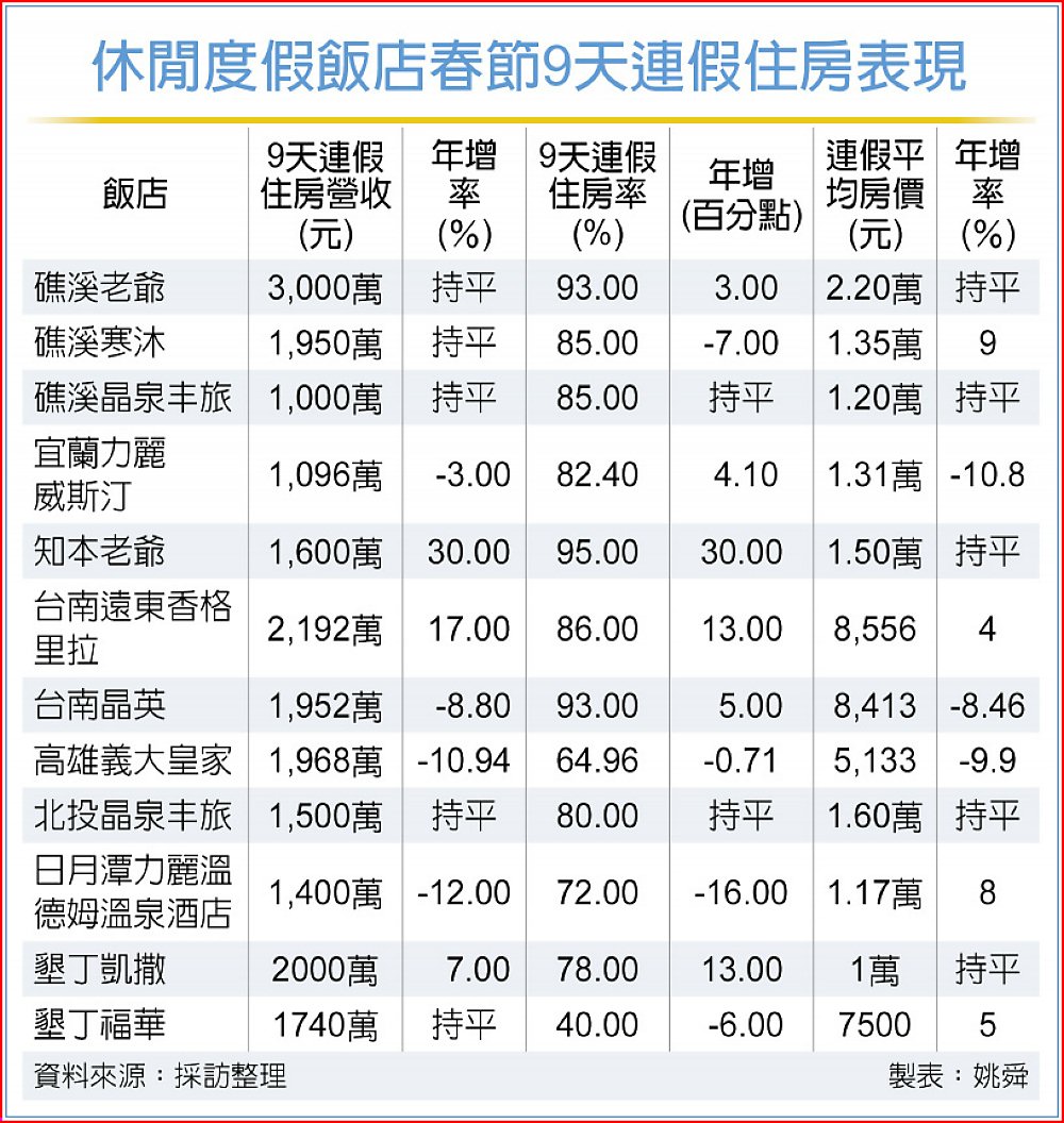 「國旅就是貴」的觀感衝擊國旅,休閒度假飯店今年春節連假期間住房率受影響,僅知本老爺、台南香格里拉與墾丁凱撒今年連假住房營收成長,礁溪老爺、礁溪寒沐、礁溪與北投晶泉丰旅、墾丁福華9天住房營收與去年同期持平,宜蘭力麗威斯汀、台南晶英、高雄義大皇家與日月潭力麗溫德姆溫泉酒店,春節連假住房營收均出現衰退。