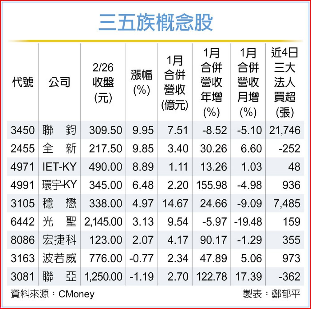 2026世界行動通訊大會(MWC)即將登場,加上美股全球磷化銦(InP)基板龍頭AXT、光通訊大廠Lumentum(LITE.US)業績雙雙報喜並釋出樂觀展望,台股相關族群訂單大進補,磊晶廠全新(2455)看好今年AI資料中心營收倍增,股價26日亮燈漲停,帶領整體族群向前衝,IET-KY(4971)磷化銦磊晶產品訂單強勁、26日股價勁揚8.89%,另穩懋(3105)、宏捷科(8086)等多檔也同步強漲,三五族概念股成市場當紅炸子雞。