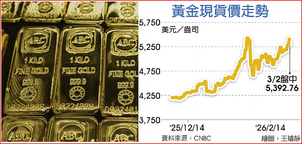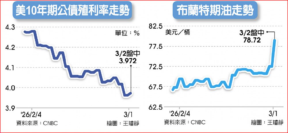 黃金現貨價一度突破每盎司5,400美元,10年期美債殖利率一度降至3.926%的11個月新低。受伊朗供應中斷擔憂影響,紐約西德州與倫敦布蘭特期油分別狂飆7.6%與8.1%。