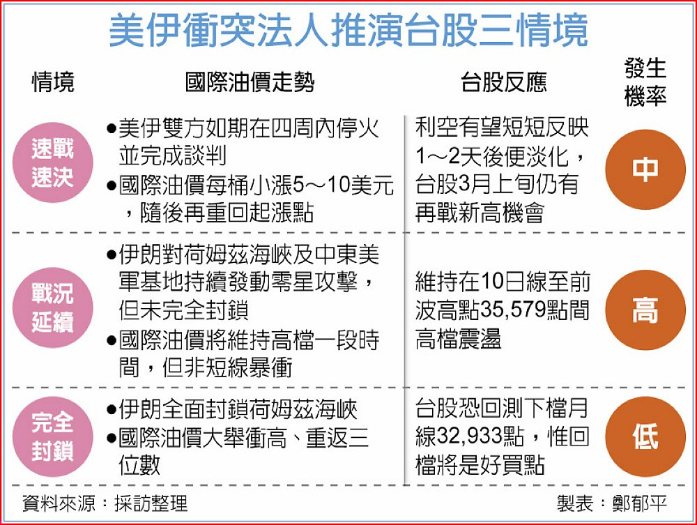 第一金投顧董事長黃詣庭分析美伊衝突三大劇本,包括速戰速決、戰線延長、海峽遭完全封鎖。美國總統川普宣示對伊朗軍事行動預計四周內完成,因此,情境一為美伊雙方如期在四周內完成談判,利空有望短短反映1~2天後便淡化,加上市場還有MWC及GTC大會雙展題材、上市櫃2月營收等利多加持,預期若此情況發生,台股3月上旬仍有再戰新高機會。