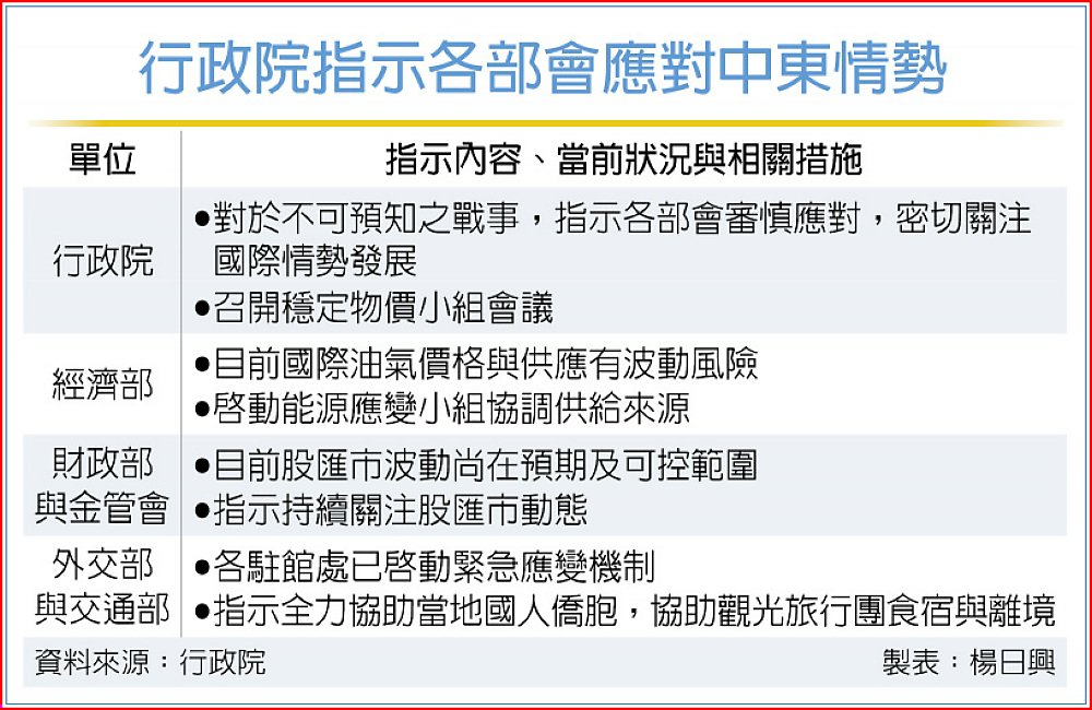 卓榮泰因此指示,經濟部啟動能源應變小組,協調能源供給來源。同時,行政院副院長鄭麗君也要召開穩定物價小組,預作因應準備。財、金兩部會則持續觀察股匯市動態。