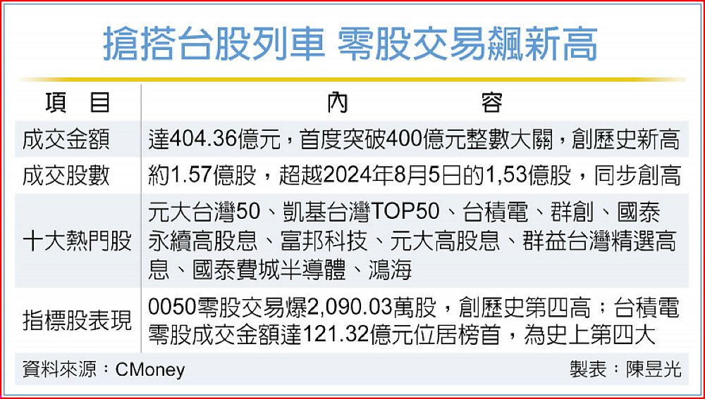 台股2日受美伊戰爭因素影響拉回,終結連七漲並測試5日線支撐,隨著盤勢急跌回檔吸引小資族搶上車,零股交易金額衝破400億元大關達404.34億元、成交股數1.57億股,同步改寫新高紀錄,元大台灣50、凱基台灣TOP50、台積電及群創等備受買盤關愛買氣升溫。
