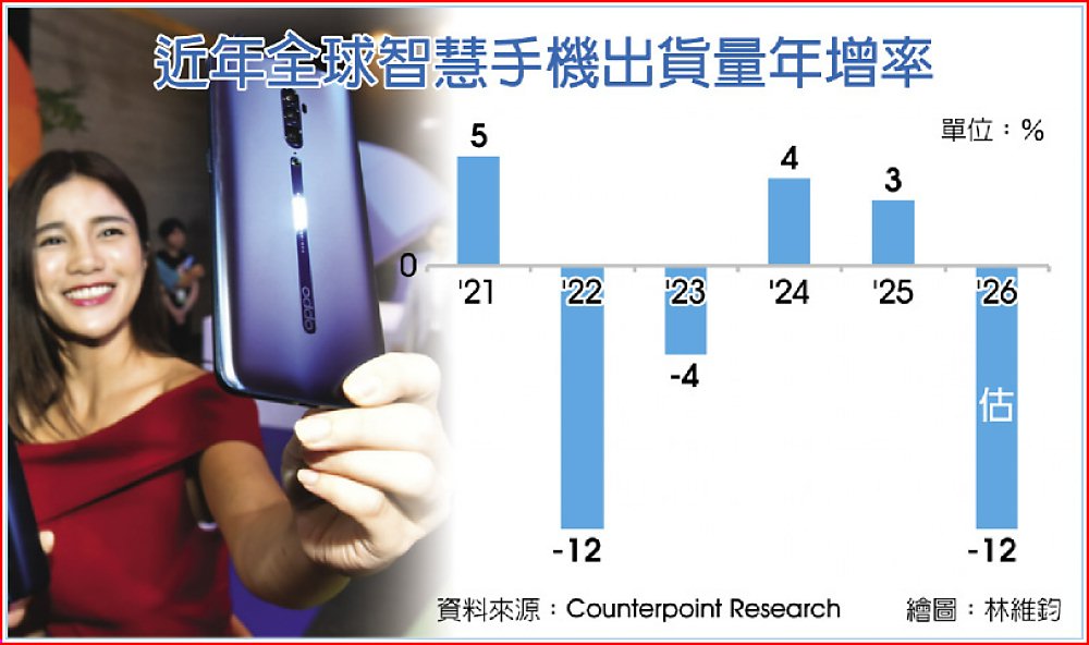 據調研機構Counterpoint Research最新調查,2026年全球智慧手機出貨量預估年減12.4%,降至略低於11億支,為2013年以來新低,也是歷來最大年度跌幅。主因是記憶體供應緊縮,調整期可能延續至2027年,並影響OEM產品規劃與上市節奏。