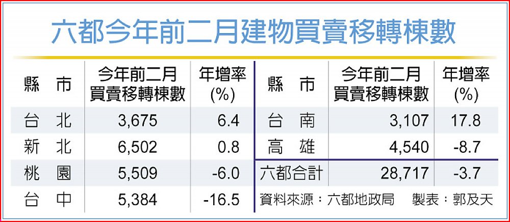 六都地政局買賣移轉棟數統計顯示,2月由於農曆春節因素,六都買賣移轉1.05萬棟、月減42.5%,創有統計以來單月第二低量。但以前二月合計來看,台南年增17.8%最高,雙北市也有個位數成長,不過台中市衰退16.5%,衰退幅度居六都之冠,各都移轉棟數呈現增減主要反映建案交屋量的變化。
