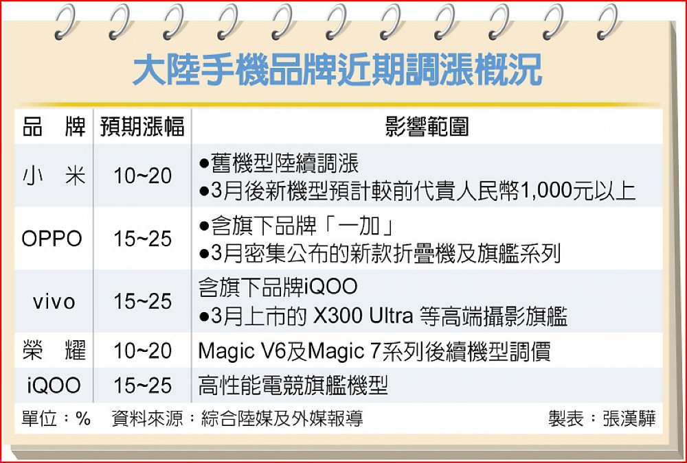 大陸品牌OPPO、一加、vivo、iQOO、小米、榮耀等已啟動漲價,3月起新品漲幅1,000元起,中高階旗艦或達2,000至3,000元,全品類同步上調。