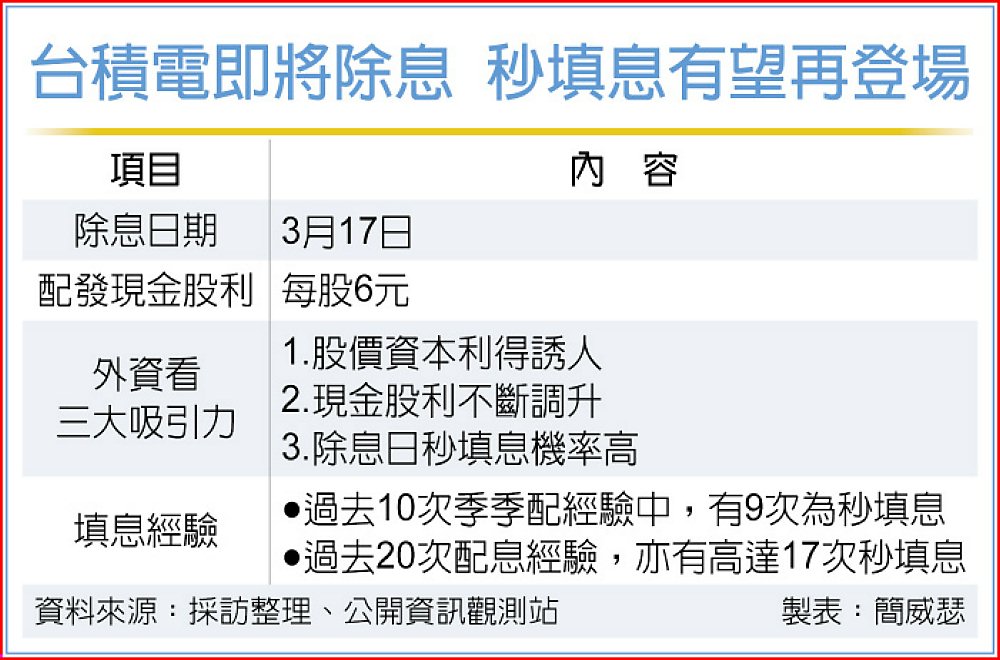 再者,考量台積電股價扶搖直上,對照年度加總的現金股利,現金殖利率雖僅落在1%~2%之間,但完全無礙市場參與台積電填息行情熱情。過去十次季季配經驗中,有九次為單日的秒填息;拉長至過去20次配息經驗,亦有高達17次秒填息。台積電為台股迅速填息資優生,當之無愧。