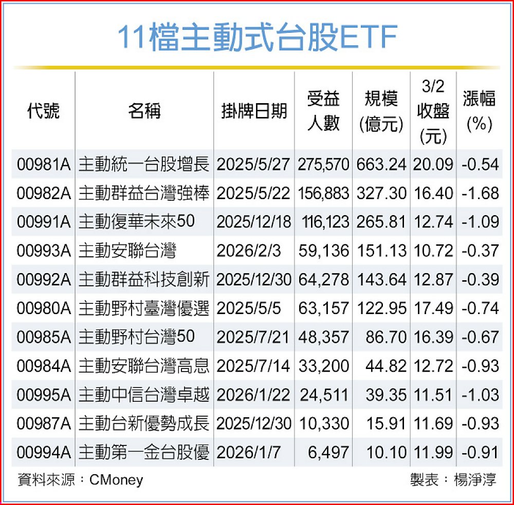 全市場主動式台股ETF總規模為1,870.96億元,其中 00981A規模達663.24億元,市占率35.45%,受益人數27.56萬人,為唯一受益人數突破20萬人的主動式ETF。2日收盤價20.09元,也是唯一市價率先站上20元的主動式台股ETF。