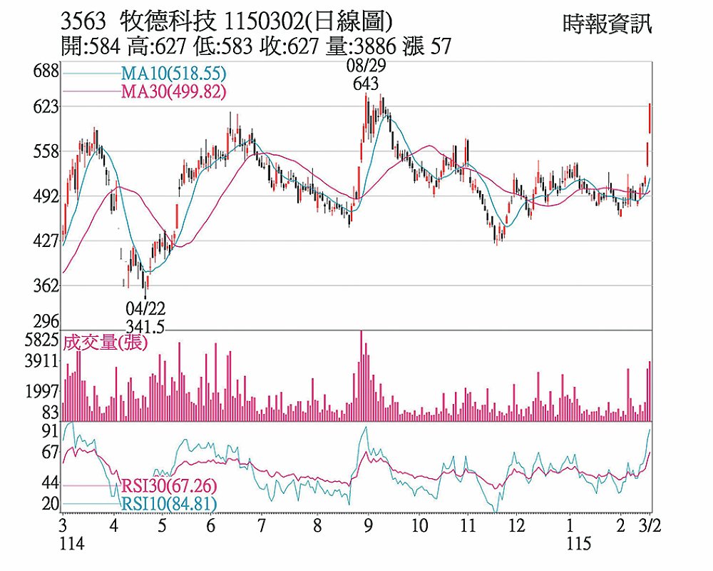 牧德(3563)正從PCB設備廠轉型半導體封裝檢測設備供應商,2日盤中急拉攻上漲停板627元,創今年來新高價,成交量同步放大,市場資金顯回流。